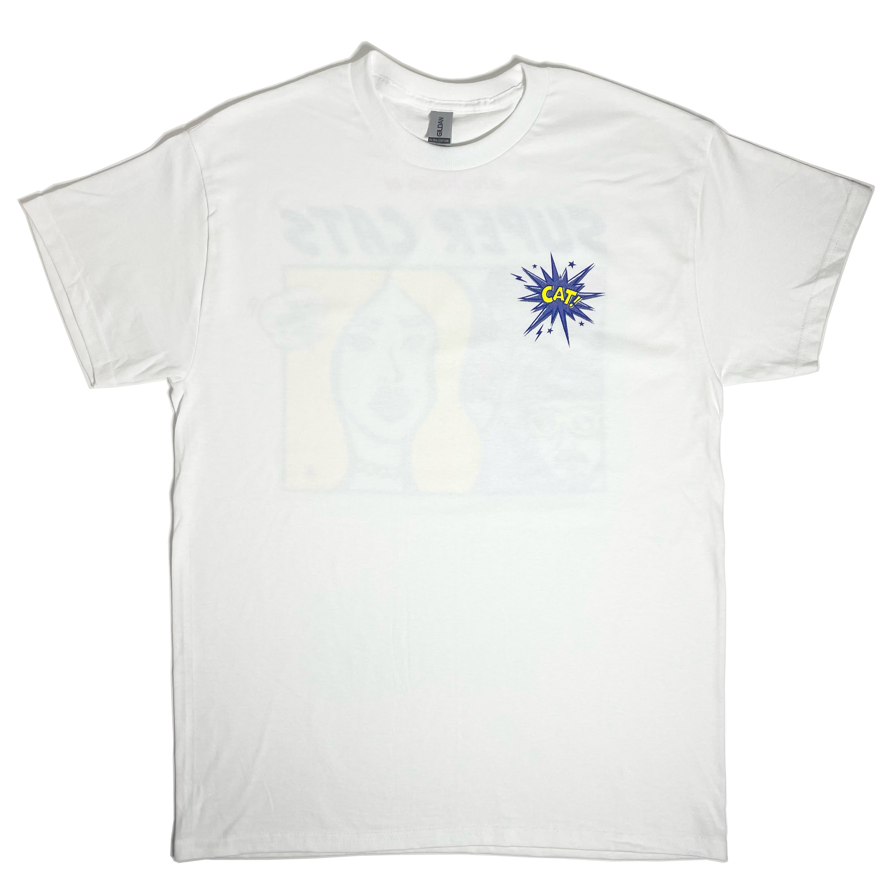 前面にCAT!のワンポイント、背面にイラストをシルクスクリーンプリントしたTシャツ。イラストはキングジョー画伯、デザインはZutsuki-D。